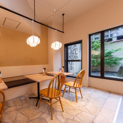 【テーブル席】大きな窓から光が差し込む明るいテーブル席。2名掛けが7卓あり、組み合わせて8名まで利用OK!和庭園を眺めながら、会話も食事も自然と弾みます♪夜は特製もつ鍋を囲みながら団らんをお楽しみください!