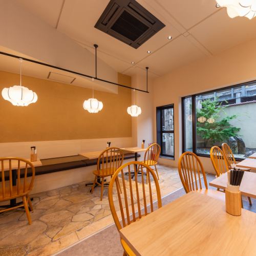 【お店の雰囲気】優しい木の温もりと和の趣が調和した、心落ち着く空間。窓の外には小さな庭もあり、ゆったりとしたひとときを演出♪ランチはラーメン、夜はもつ鍋でが楽しめます。